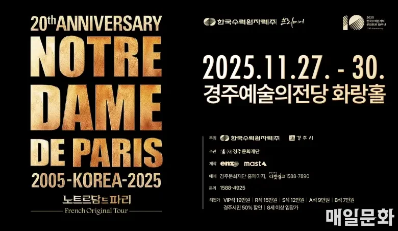 1998년 프랑스 초연 이후 전 세계 30개국, 9개 언어로 공연되며 누적 관객 1,500만 명 이상을 동원한 <노트르담 드 파리>는 빅토르 위고의 동명 소설을 원작으로 인간의 욕망과 집착, 사랑과 비극을 웅장한 무대예술로 풀어낸 글로벌 스테디셀러다. 특히 2005년 한국 초연 이후 20년 동안 꾸준히 사랑받아온 이 작품은 올해 한국 투어 20주년을 맞아 경주에서 특별한 여정을 이어간다.
